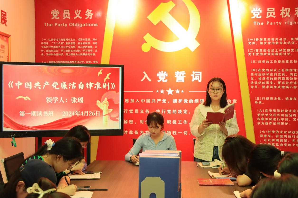 为深入学习领悟习近平总书记关于党纪学习教育的重要指示精神,加强党的纪律建设、推动全面从严治党向纵深发展,4月26日,永利yl23411集团学生党支部在“一站式”党团活动室开展了第一期党纪学习教育读书班活动,学生党员赵艺菲和张瑶带领八名入党积极分子进行学习。