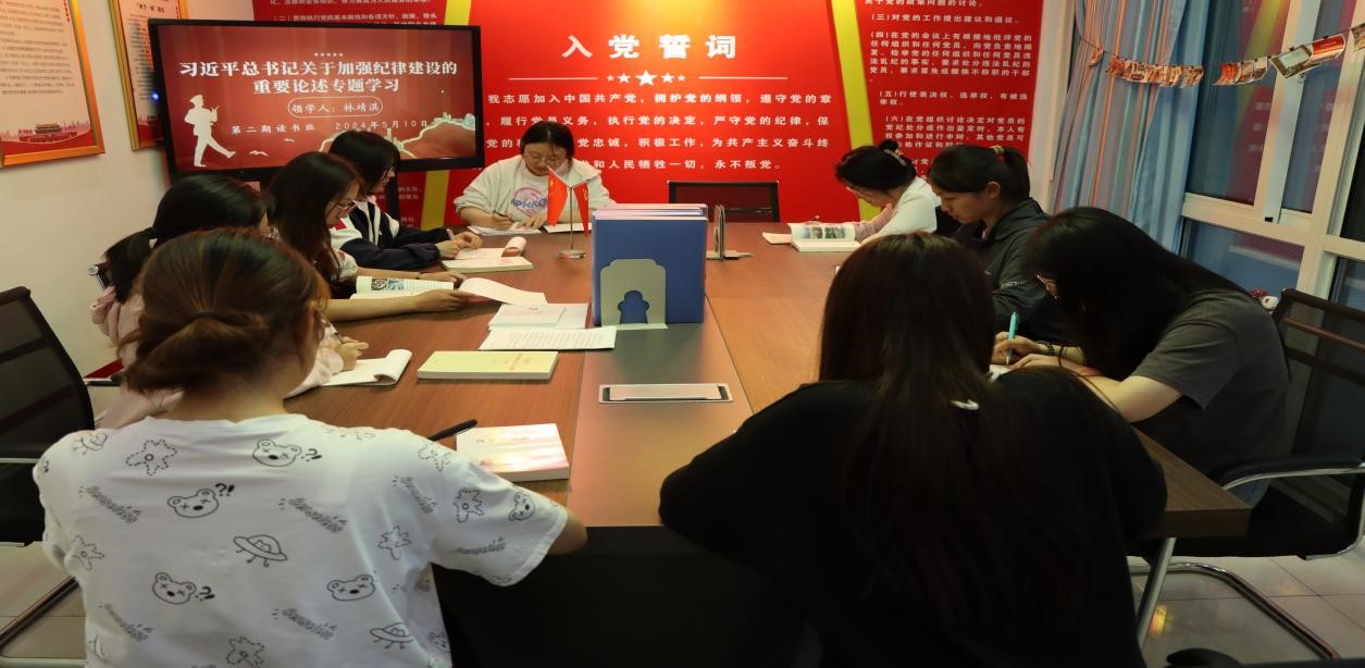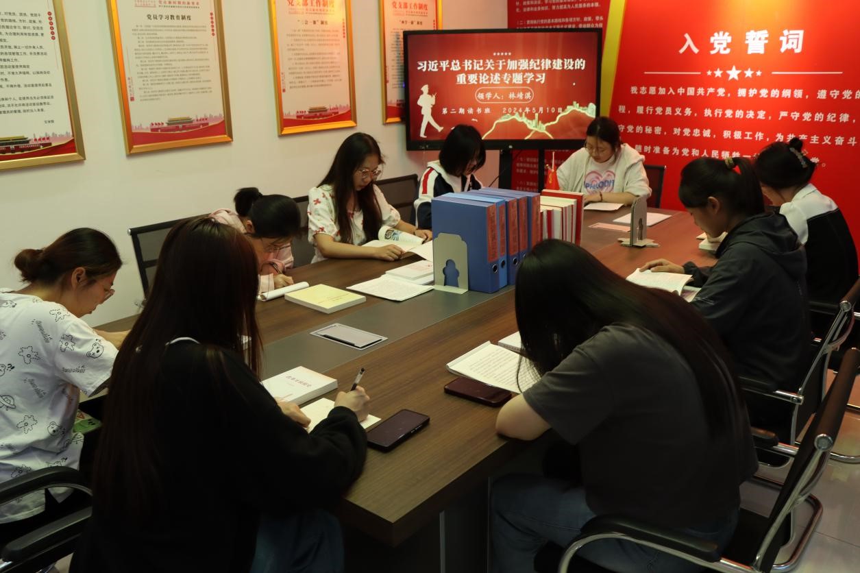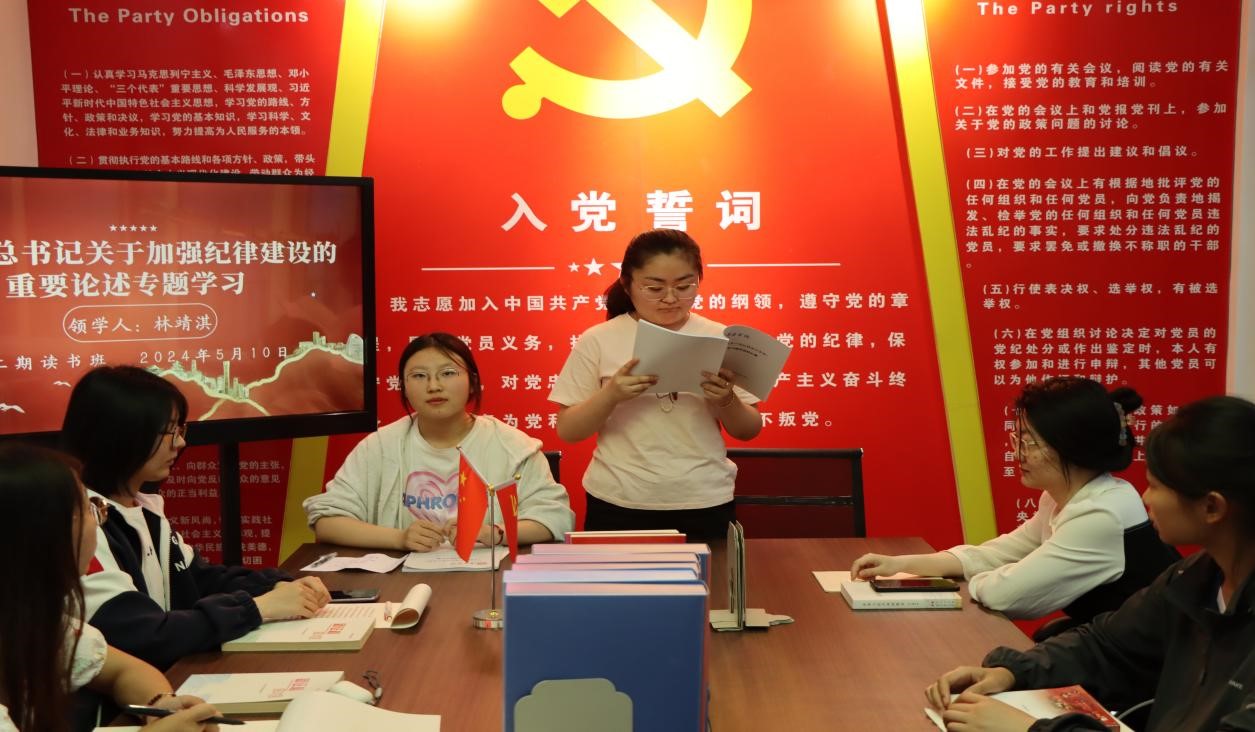 为深入学习贯彻习近平总书记关于加强纪律建设的重要论述,进一步落实全面从严治党要求,加强党员的党性修养,强化纪律意识,5月10日,永利yl23411集团学生党员在“一站式”党团活动室开展了第二期党纪学习教育读书班活动,学生党员庄琪和林靖淇带领十位入党积极分子进行学习。