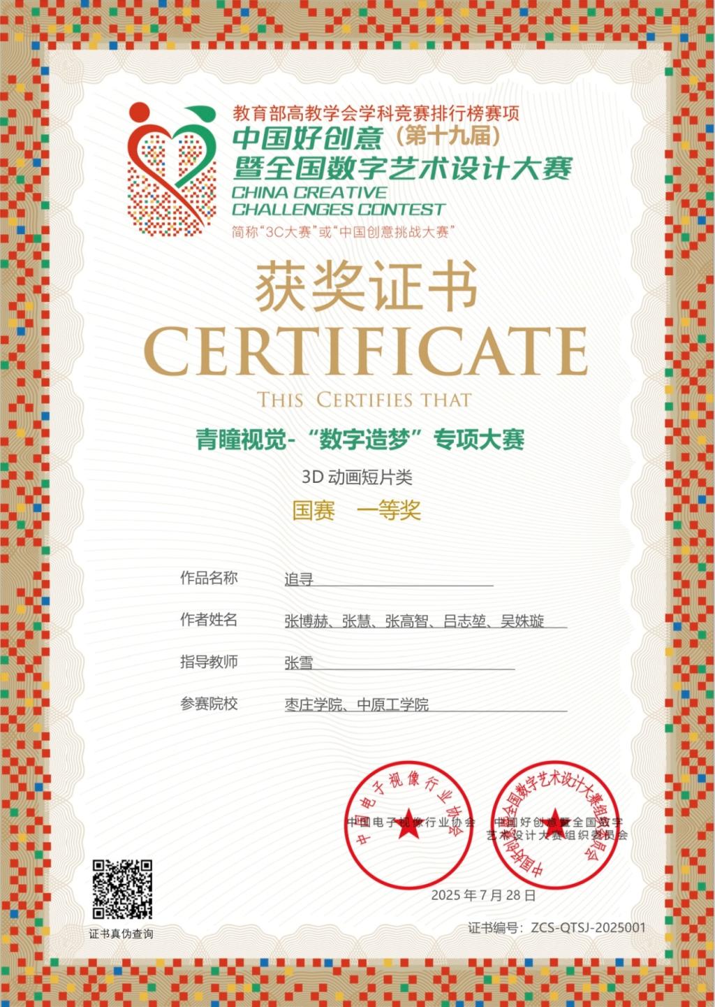 2025年7月17至20日,第十九届中国好创意暨全国数字艺术设计大赛青瞳视觉-“数字造梦”48小时计时赛在上海圆满落幕。永利yl23411集团(传媒学院)教师张雪和4名学生张博赫、张慧、吴姝璇、张高智经过激烈角逐,凭借作品《拾梦者》荣获3D动画短片组全国一等奖。