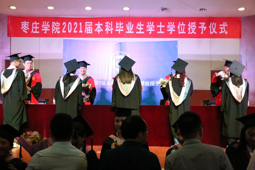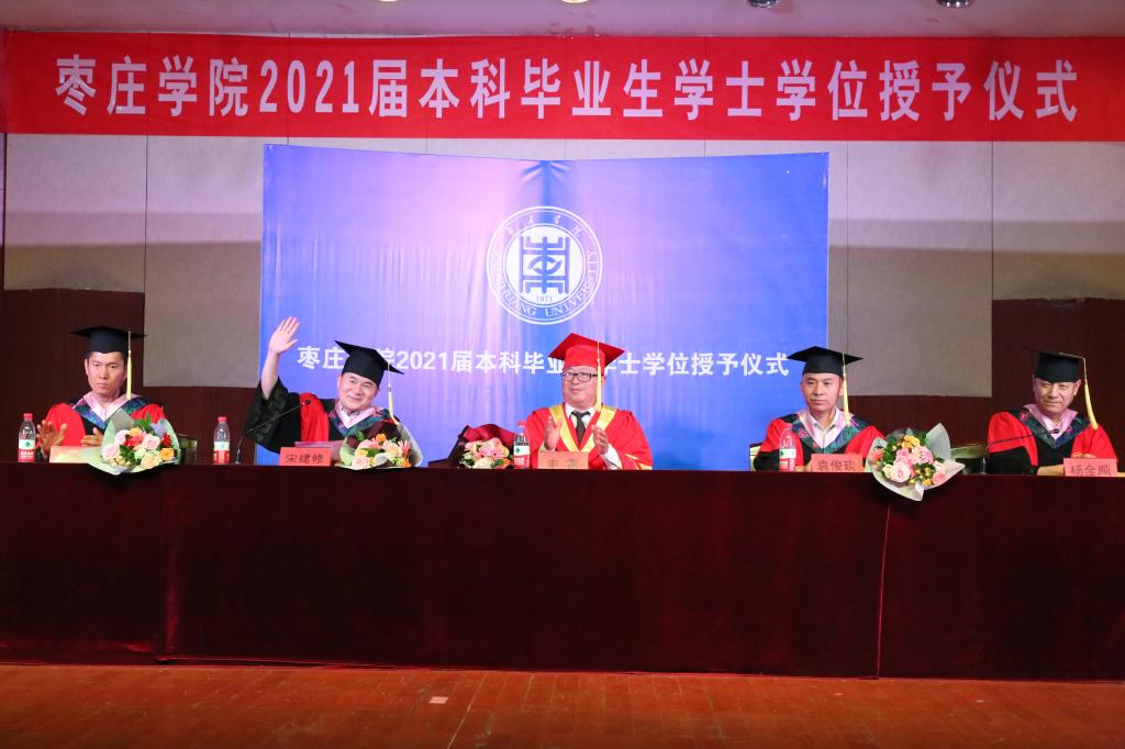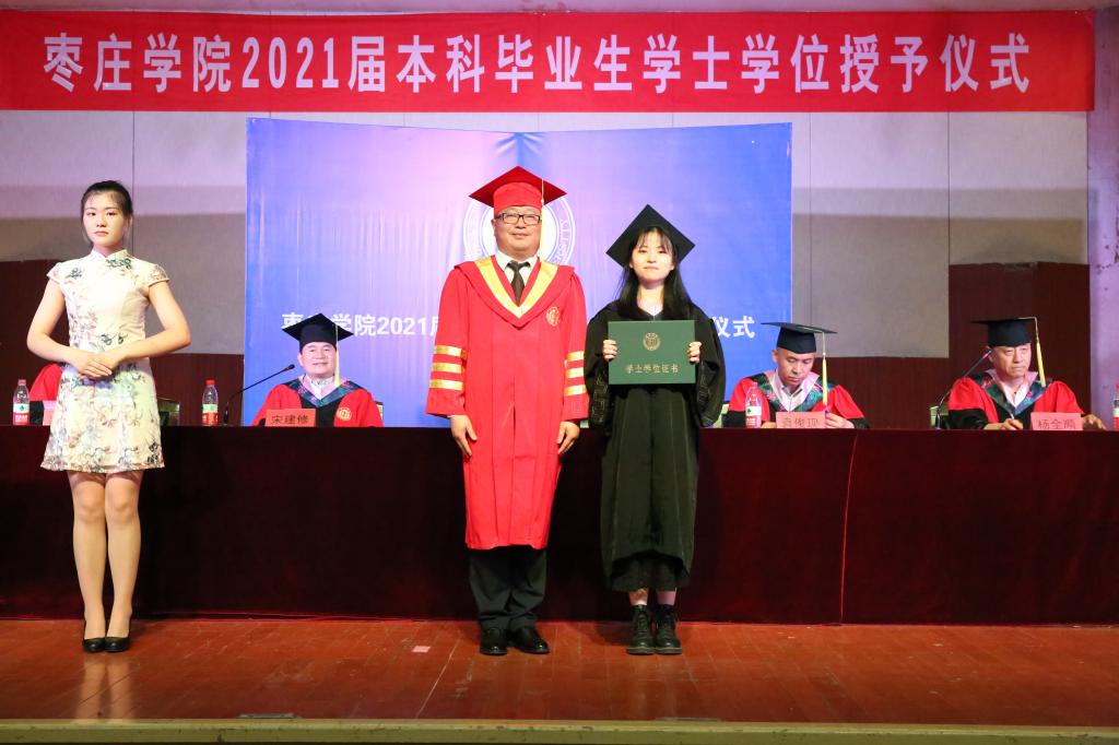 仪式在庄严的国歌中拉开帷幕。在同学们的热烈欢迎中,段圣玉宣读了《yl23411永利关于授予本科毕业生学士学位的决定》,丰雷为永利yl23411集团2021届194名本科毕业生一一拨穗并授予学士学位证书,为他们送上祝福并合影留念。随后,成功考取枣庄市委组织部选调生的杨凯丽作为优秀毕业生代表发表毕业感言,表达对母校、学院和老师们的感谢和敬意;教师代表张凯老师向毕业生做离别赠言,希望同学们能够目标不移、砥砺前行,慷慨激昂的话语中充分展露出我院老师们对全体毕业生的祝福和关爱。最后,杨全顺发表致辞,为毕业生送上深情的嘱托,并提出殷切的希望,希望同学们学会适应社会、规划未来人生、坚信天道酬勤,努力做一个积极向上,脚踏实地,开拓创新的人。