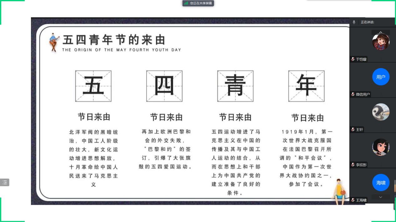 本次学习活动,由学院辅导员联合班团两委采取线上线下结合的方式开展。各班团支书精心准备,通过视频、图片、PPT等形式,详细阐述了开展本次活动的意义所在,介绍了五四青年节的来源,着重学习了习近平新时代中国特色社会主义思想主题教育及习近平给中国农业大学科技小院学生的回信等内涵,同时也希望同学们志存高远、脚踏实地,把课堂学习和乡村实践紧密结合起来,为加快推进农业农村现代化、全面建设社会主义现代化国家贡献青春力量。