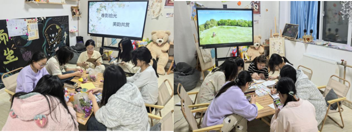 本次活动通过制作花卉标本、绘制春日主题图画,以及鉴赏电影和文学作品中的春日美学等多种形式展开。活动伊始,同学们利用前期采集的花草制作标本,定格春天的美好瞬间;他们用画笔描绘春日暖阳、繁茂花木等景象,生动展现了春天独有的蓬勃生机。电影片段的放映引导同学们深入探索影视作品中的春日美学表达,进一步深化了对春天的感知。观影结束后,同学们摘录文学作品中的优美文字,深刻感受字里行间的花香鸟语。同学们纷纷表示对此次丰富多彩的春日活动的喜爱,并称从活动中更深刻地感受到了春天的独特魅力,对春天更加倾心,深刻体会到了春日独有的情怀。