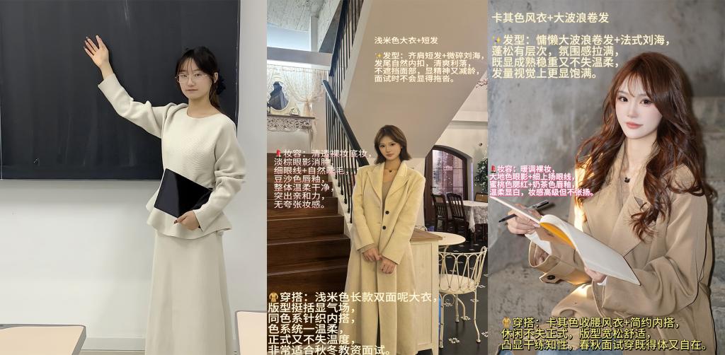 活动设妆容分享与穿搭展示两大环节。妆容分享环节中,同学们紧扣教资、教师编、事业编等面试场景,重点传授清透自然、提气显神的“伪素颜”技巧,以清透底妆与自然修饰提亮气色,展现良好的精神面貌。此外,同学们还围绕校园日常、社交聚会、音乐节等不同场景,分享元气淡妆、创意应援妆、清透裸妆等技巧,以精致得体的面容增强自我认同感,由外而内提升社交自信,展现专属于学生的活力与朝气。在穿搭环节里,大家通过图文笔记、视频等方式,聚焦应试干练通勤风,助力打造面试好印象。另外,同学们还分享了慵懒休闲、活泼联谊、创意应援等多元风格,满足不同场景的形象需求,通过色彩搭配、材质选择等实用知识,帮助学生塑造专属个人风格。