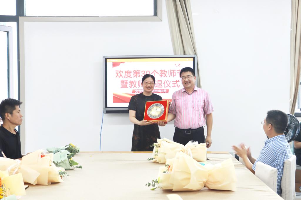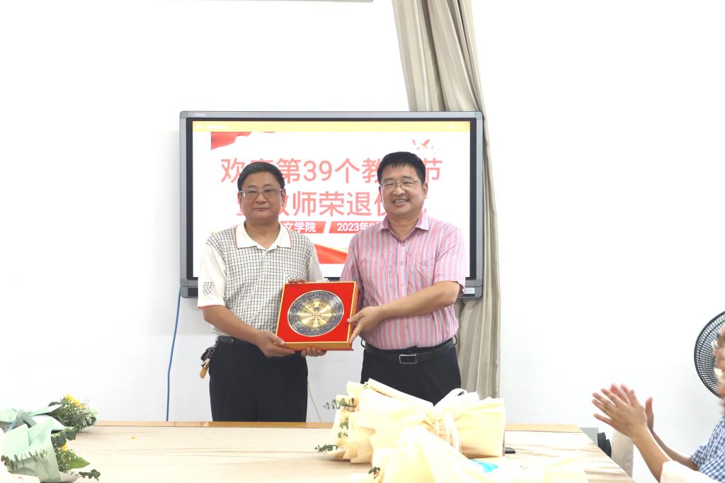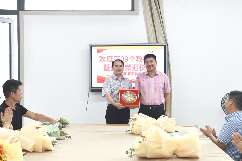 张爱民、宋建修为即将荣退的曹新伟教师和年满30年教龄的教师颁发纪念品。张爱民代表学院向全体教职员工致以节日的问候和崇高的敬意,他回顾了永利yl23411集团46年筚路蓝缕的发展历程,肯定了退休教师30多年来为学院发展做出的突出贡献,对退休教师表达了感谢和不舍之情,并希望退休后能够继续支持学院事业发展。