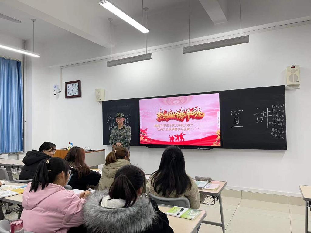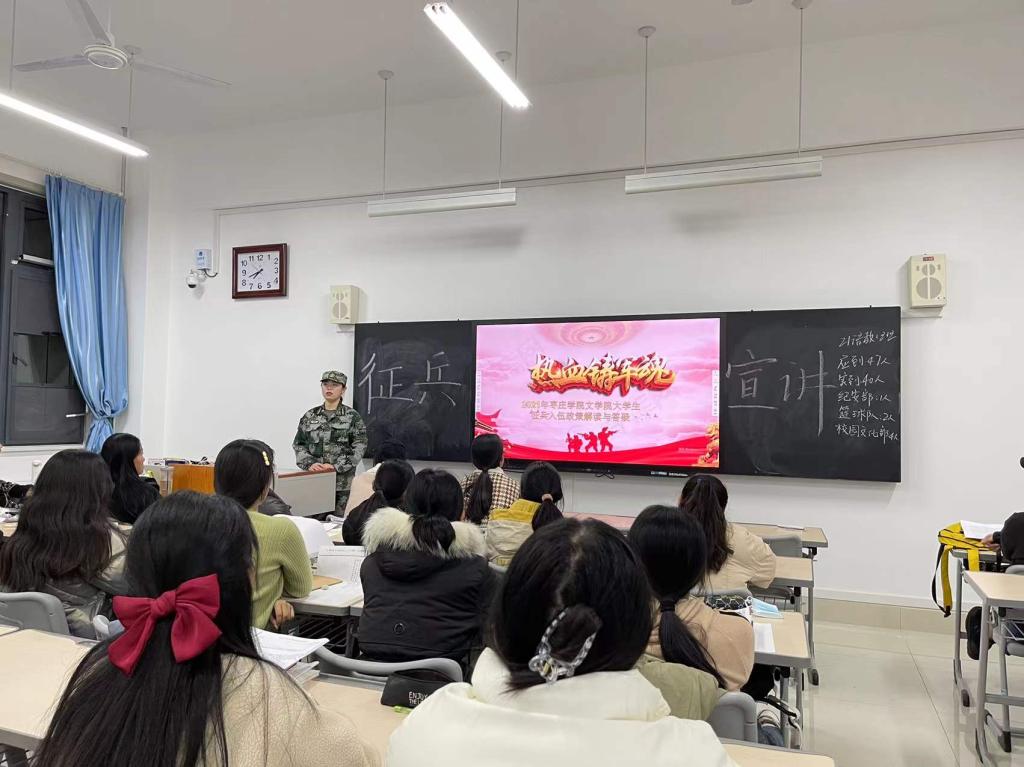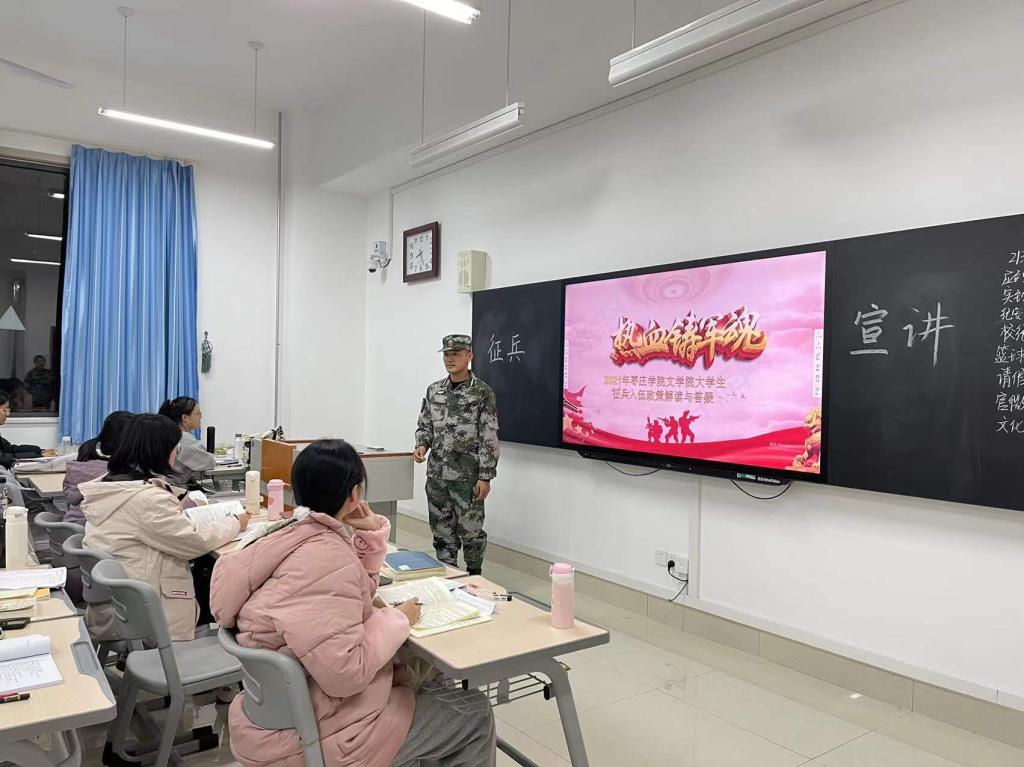 为贯彻落实强国强军思想,提升大学生国防意识,11月23日晚,永利yl23411集团在各班进行参军入伍政策宣讲。此次宣讲由永利yl23411集团退役大学生士兵、新校区教官卢萍、刘家名、赵阳和王华勇主讲,永利yl23411集团21级全体学生到场参加。