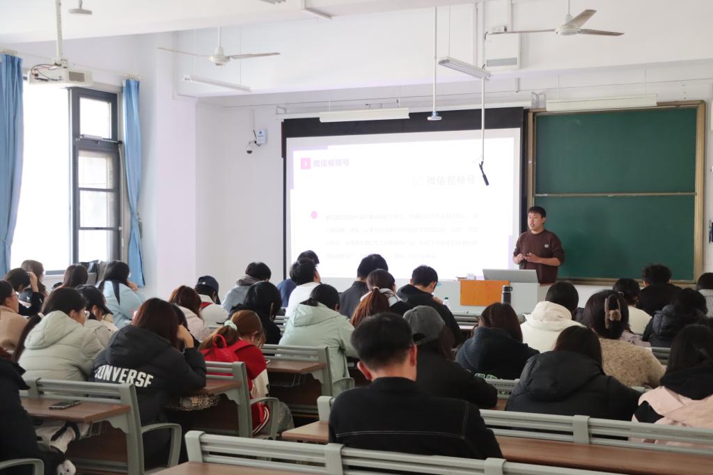 在报告中,徐继栋结合个人运营经历,从平台选择、用户定位、运营技巧以及新媒体运营未来设想四个方面展开,他理论结合实践,以鲜活的案例向同学们展示如何通过音乐文案视频来让作品提升流量;分析各类视频的舆情引导,让同学们学习如何洞悉时代热点,合理利用策划,掌握舆情主动权。最后,徐继栋勉励同学们努力学习专业知识,争取成长为一名对社会有贡献的新媒体宣传者。