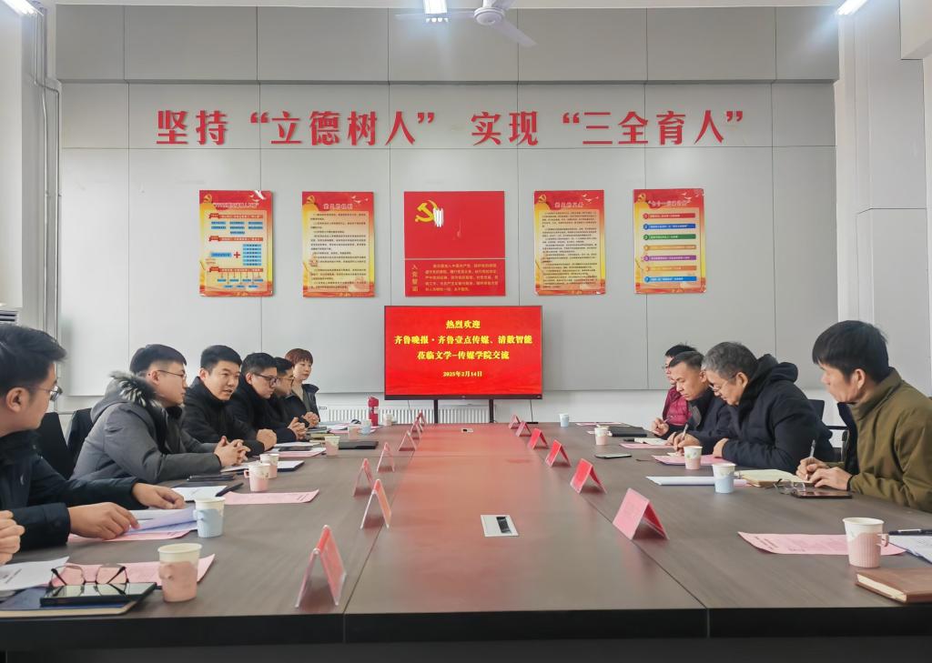 2月14日,齐鲁晚报·齐鲁壹点传媒副总经理、大数据中心主任郭强、清数智能董事长曲敬民等一行8人莅临我校,在博雅楼B214会议室开展了数字文化融合创新实验室建设座谈交流活动。合作发展处(校友办)处长袁俊现和文学(传媒)学院部分领导、教师参加交流,会议由学院院长张爱民主持。