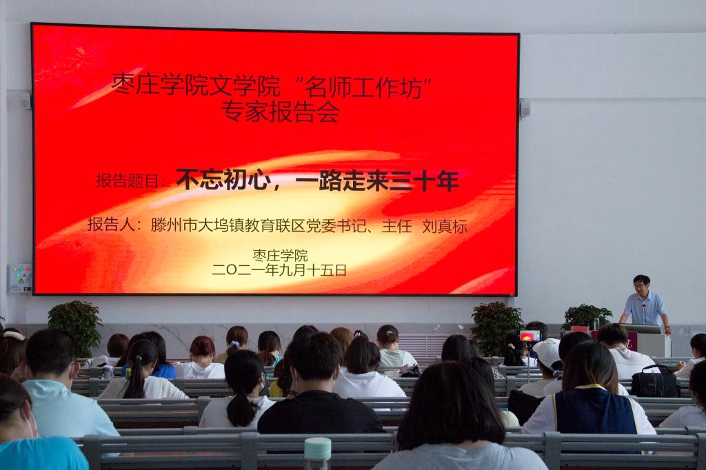 为了培育师范生的良好师德,提高专业素养与教育教学能力,9月15日下午,永利yl23411集团于增信楼报告厅3113室举行了“名师工作坊”专家报告会。本次报告会由永利yl23411集团副院长段圣玉主持,滕州市大坞镇教育联区党委书记、主任刘真标主讲,永利yl23411集团师生200余人与会聆听报告。