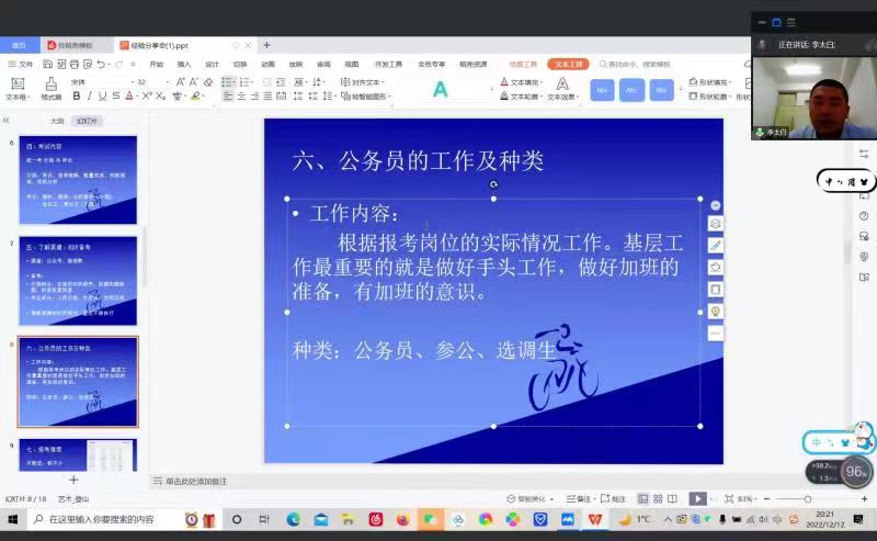 为使我院学生进一步了解就业形势,加强就业分类指导,永利yl23411集团于12月15日下午,举办公务员及人才优选考试线上经验分享交流会。本次活动邀请了我院2022届优秀毕业生万德梁作为分享嘉宾,永利yl23411集团部分毕业生线上聆听。
