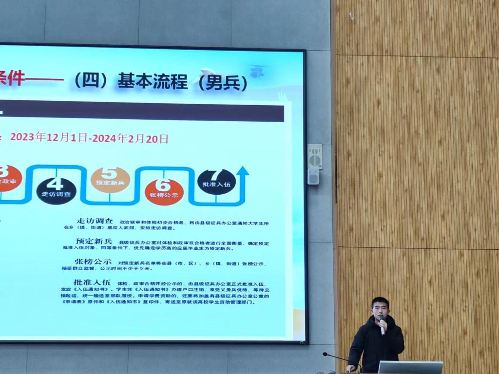 为加强征兵政策宣传,鼓励和引导在校大学生积极参与应征入伍,激发学生报效祖国,献身国防的热情,11月28日晚,永利yl23411集团在增信楼113室举行征兵宣传主题活动。此次活动邀请了优秀退役士兵花英杰、朱硕、朱保逸、肖建超和滕鑫为大家进行宣讲。